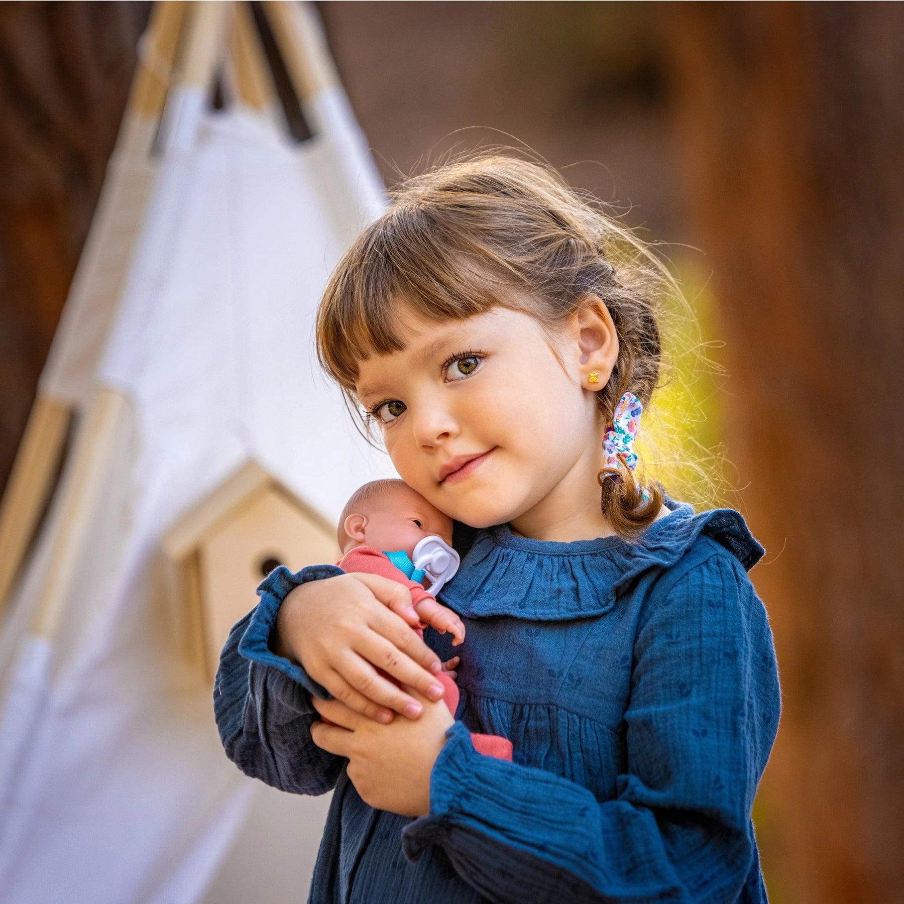 • 9.5" ANATOMICALLY CORRECT REAL GIRL BABY DOLL // Brown Eyes / Includes washable baby doll dressed in a nature-themed outfit, and matching sleeping bag and pacifier.