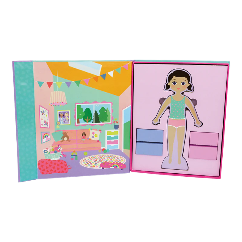 Children can have DOUBLE the fun with our Magnetic Dress Up Best Friends set. Includes 2 magnetic dolls (who are also the BEST of friends), contains over 70 magnetic outfit and play pieces to mix and match for endless combinations. Fold the box out to create a magnetic play room scene and a fun outdoor play scene! The lovely reusable box comes with a magnetic closure and keeps all parts safe for next time!