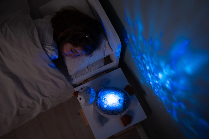 Tranquil Penguin™ is a cute musical nightlight that glows with a soft light and projects polar underwater light effect on the bedroom ceiling, thanks to a unique patented mechanism. Tranquil Penguin™ musical nightlight soothes baby and reassures children who are afraid of the dark. A soft plush during the day, it transforms into a nightlight at night. The moving color projection in two colors creates a magical polar light effect. Melodies and white noises will soothe the little ones to help carry them away to dreamland. It has 4 soothing sounds: underwater melody, Tranquil melody, whale song, ocean waves and 6 adjustable volume levels. An intelligent Cry Sensor, with adjustable sensitivity, restarts at baby's first cry. The brightness of the projection can be adjusted to suit different environments. The 23-minute timer ensures complete darkness and silence while your child sleeps soundly. The battery is recharged using a USB-C cable. Tranquil Penguin™ nightlight is made of 100% recycled padding and stuffing from plastic bottles, with GRS certification, and comes in a FSC certified packaging, which contributes to biodiversity sustainability. Tranquil Penguin™ is an eco-responsible and environmentally friendly plush toy.