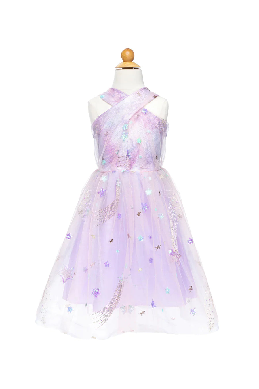 Adorned with a constellation of stars, this dress adds a touch of celestial charm to any occasion. The lilac hue brings a soft and elegant touch, while the cross-strap top adds a playful and stylish element.