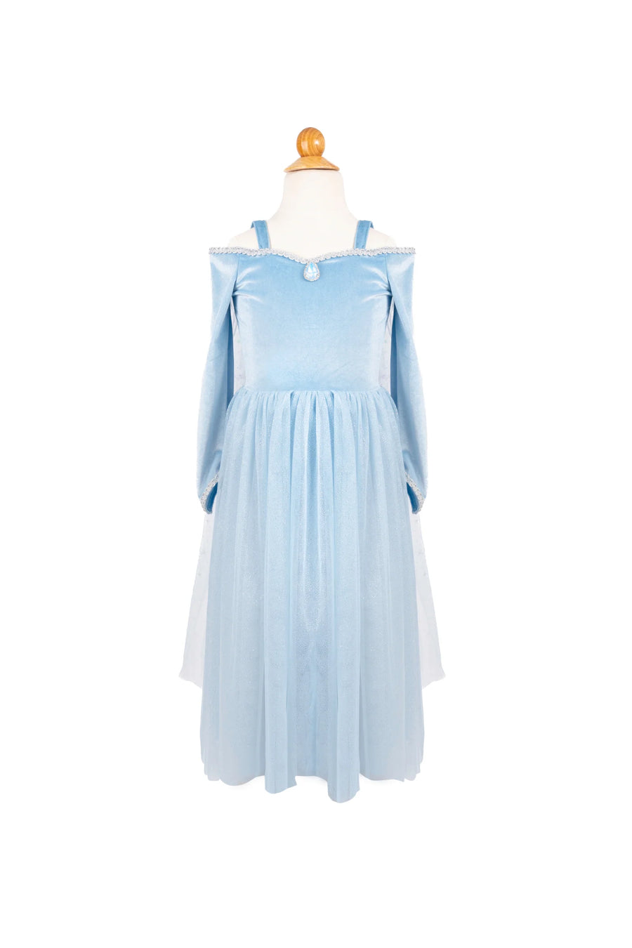 Step into a world of enchantment with the Velvety Soft Sisters Forever Princess Dress, a magical creation inspired by the bond of sisterhood. The light blue velvet top offers a soft, luxurious feel, while the spaghetti straps and off-the-shoulder long sleeves add a touch of elegance. The top is beautifully trimmed with silver accents and features a sparkling blue gem in the center of the chest, adding a royal flair.
