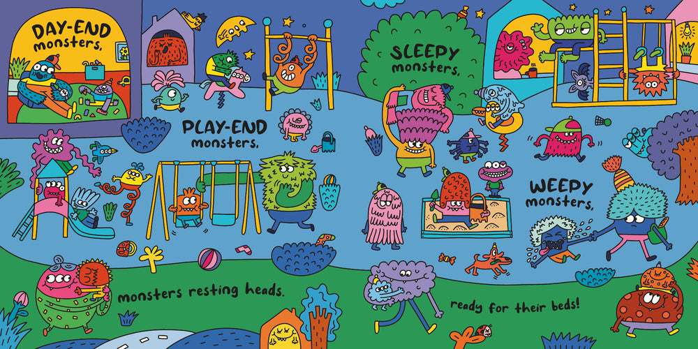 Energetic, whacky and characterful monsters are drawn in a vibrant, contemporary style by Ukranian illustrator Nina Dzyvulska. Meet sleepy monsters, weepy monsters, teeth-brushing monsters, toilet-flushing monsters, splashing monsters, crashing monsters… even spot and follow a cheeky little monster  who does everything to avoid bedtime! Then settle in with bedtime-story monster, cuddle monster and of course all the loudly snoring monsters in a snuggled-into-bed ending for all.