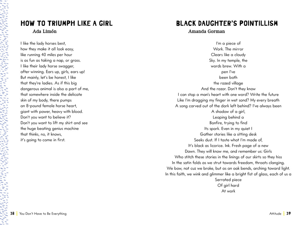 The cast of 68 poets is extraordinary: Amanda Gorman, the first National Youth Poet Laureate, who read at Joe Biden's inauguration; bestselling authors like Maya Angelou, Elizabeth Acevedo, Sharon Olds, Naomi Shihab Nye, and Mary Oliver; Instagram-famous poets including Kate Baer, Melody Lee, and Andrea Gibson; poets who are LGBTQ, poets of diverse racial and cultural backgrounds, poets who sing of human experience in ways that are free from conventional ideas of femininity. Illustrated in full color with work by three diverse artists, this book is an inspired gift for daughters and granddaughters—and anyone on the path to becoming themselves.