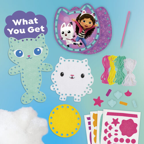 Make your favorite cats and characters from the world of Gabby's Dollhouse. This kit includes everything you need, with none of the guesswork, to help you build beginner skills. Use lacing cards, yarn, and a plastic needle to get the basics down pat. Then move on to the pre-punched felt pieces to create a couple of cat-tastic projects!