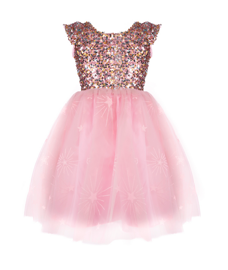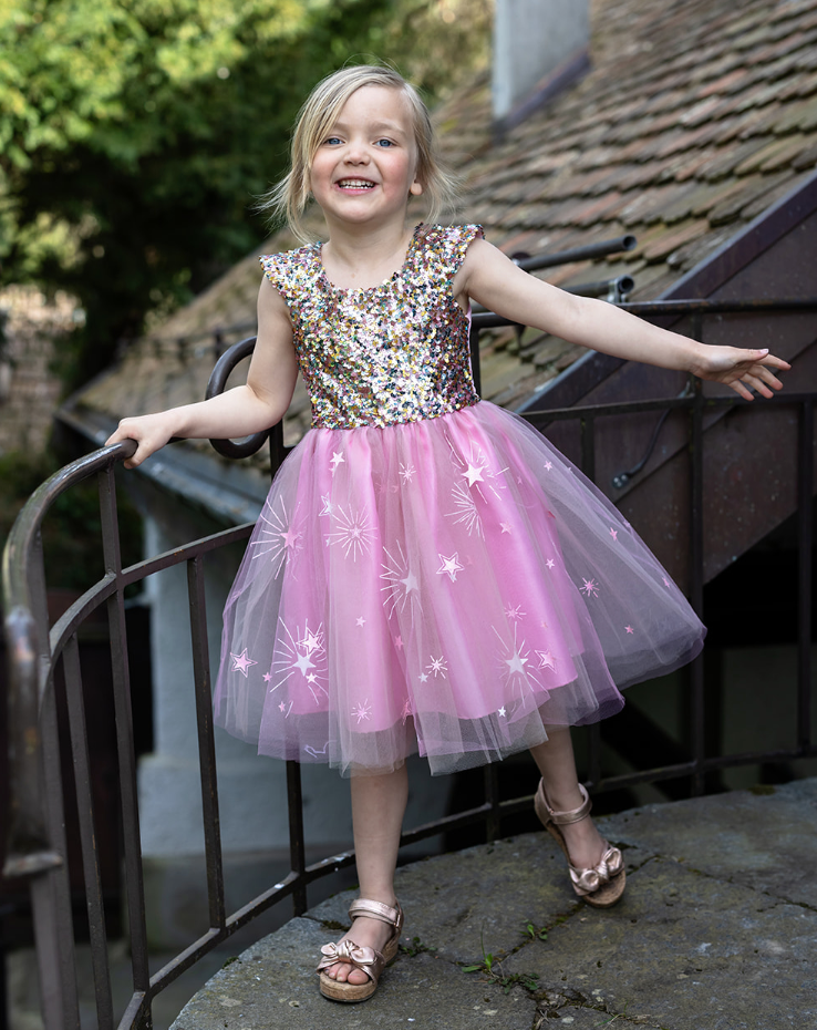 Great Pretenders A Star is Born Sequins Dress is a magical mix of sparkle and starry charm! This show-stopping dress features a vibrant sequin bodice in a stunning blend of pink, blue, gold, and silver sequins that glimmer and shine with every move, perfect for shining on a stage or lighting up the room at any celebration! The back side is stretchy and the elasticized waistband allow for comfort and size flexibility. Flowing from the glittering top is a dreamy pink tulle skirt, adorned with shimmering pink stars that add a touch of whimsy and wonder.