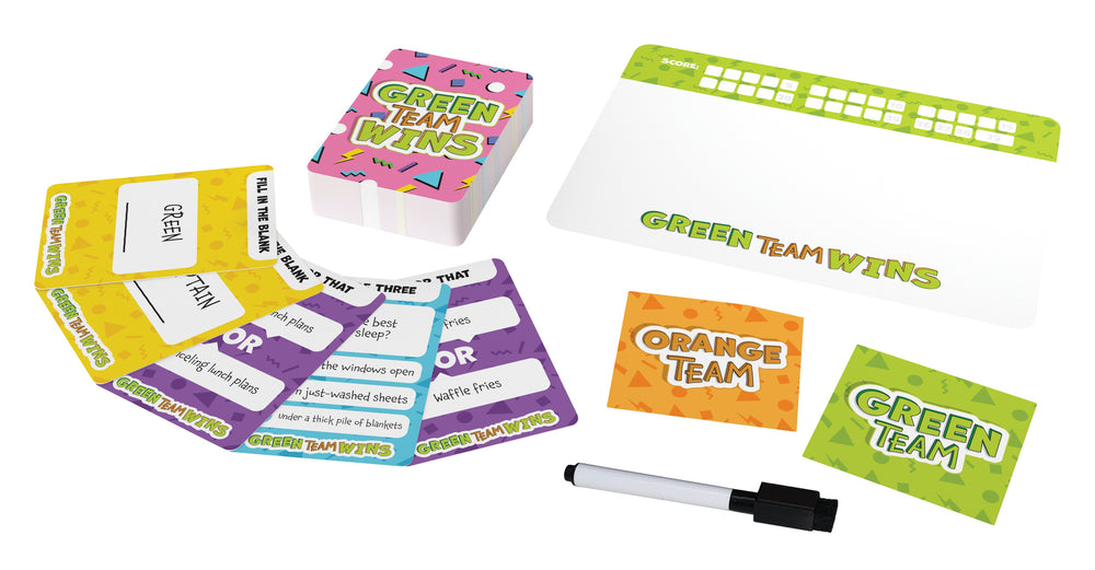 The Green Team always wins! Think like everyone else and earn a spot on the Green Team. Play through 15 rounds of cards and write down what you think is the most common answer in the room. There's no such thing as a wrong answer because the Green Team always wins! Includes 210 Question Cards, 6 Two-Sided Team Indicators, 6 Dry-Erase Boards, 6 Dry-Erase Pens, and Complete Instructions. Recommended for 3-6 players, ages 10 and up.