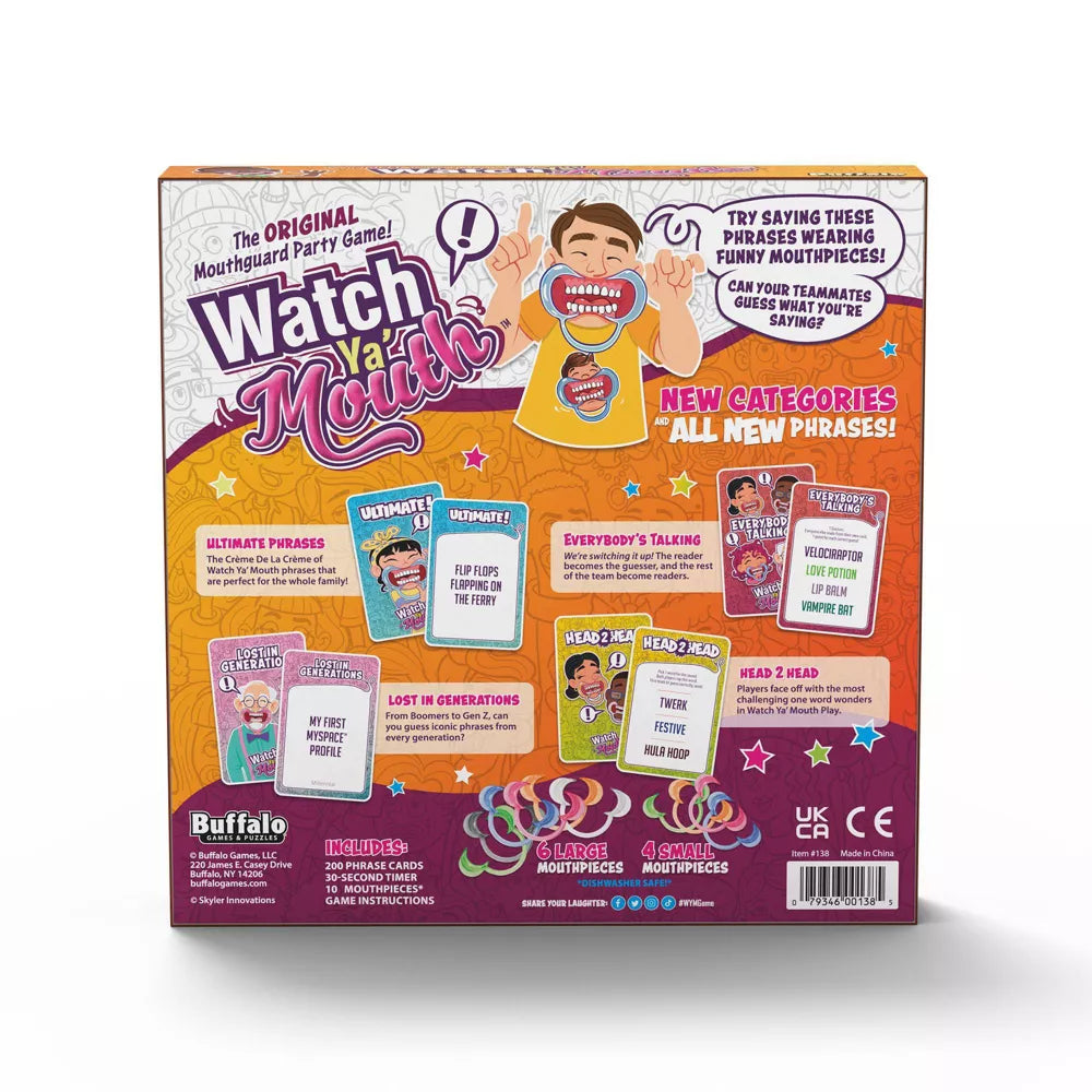 Watch Ya' Mouth is The Authentic, Hilarious, Mouth-guard Party Game now featuring new content and categories! Teams of players, hampered by cheek retractors, attempt to read and interpret phrases from 4 unique card decks: Ultimate!, Lost in Generations, Head 2 Head, Everybody's Talking.