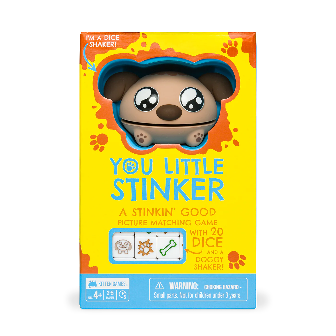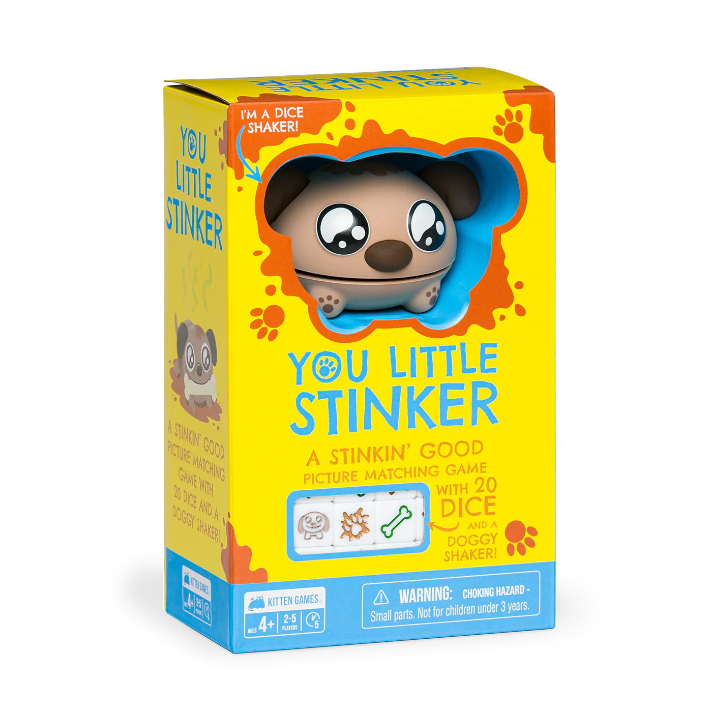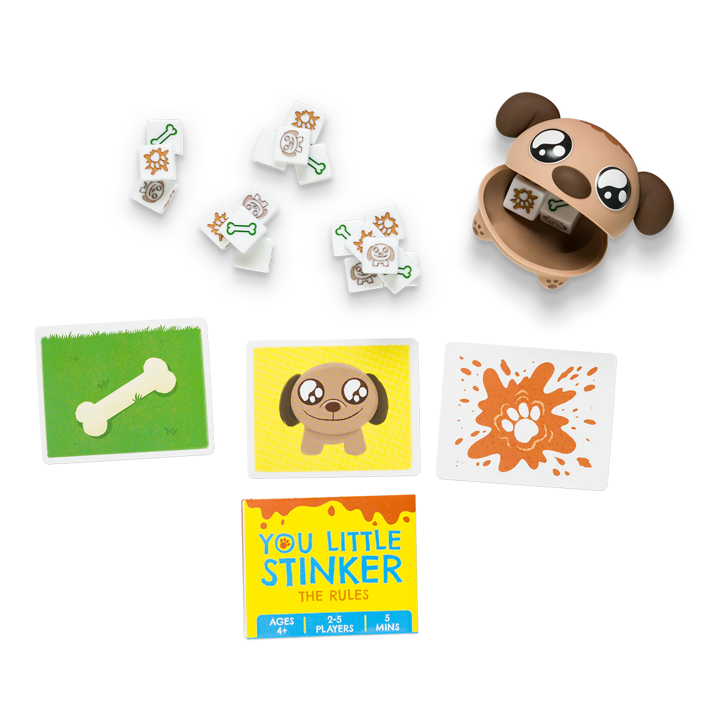 Put the dice in the Doggy Shaker –he spits it out when you’re ready! Match the dice with the corresponding picture cards. Bones are super lucky, but watch out for those stinky mud puddles! The first player to get rid of all their dice wins. With a few lucky rolls and a few smart choices, you could be the Stinker that ends up on top!