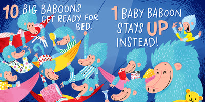 Good Night, Baboon! stars one very cheeky baby baboon who’s just too jazzed to slumber as he bounces through a countdown of sleepy animals brushing their teeth, reading bedtime stories, until finally: