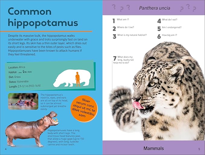 Every creature in this book is shown in beautiful detail, with quiz questions surrounding its portrait which will encourage engagement. Turn the page to find the answers to the questions – delivered in fast-fact style, including what they eat, where they live, how big they are compared to humans, and more images and facts.