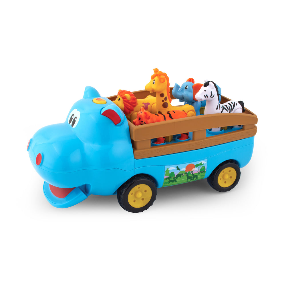 Get ready for a wild ride with Harry Hippo Safari Truck! This free-wheeling truck features engine revving sounds and fun music, while 5 removable jungle animals bring the adventure to life. Each animal has posable features and activates their own unique sound when placed in the truck. 2 AA Batteries included. Let the safari begin!