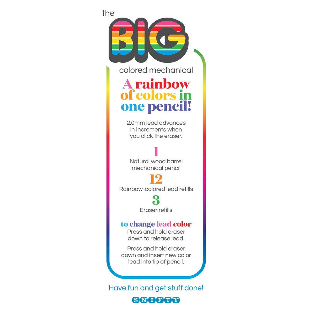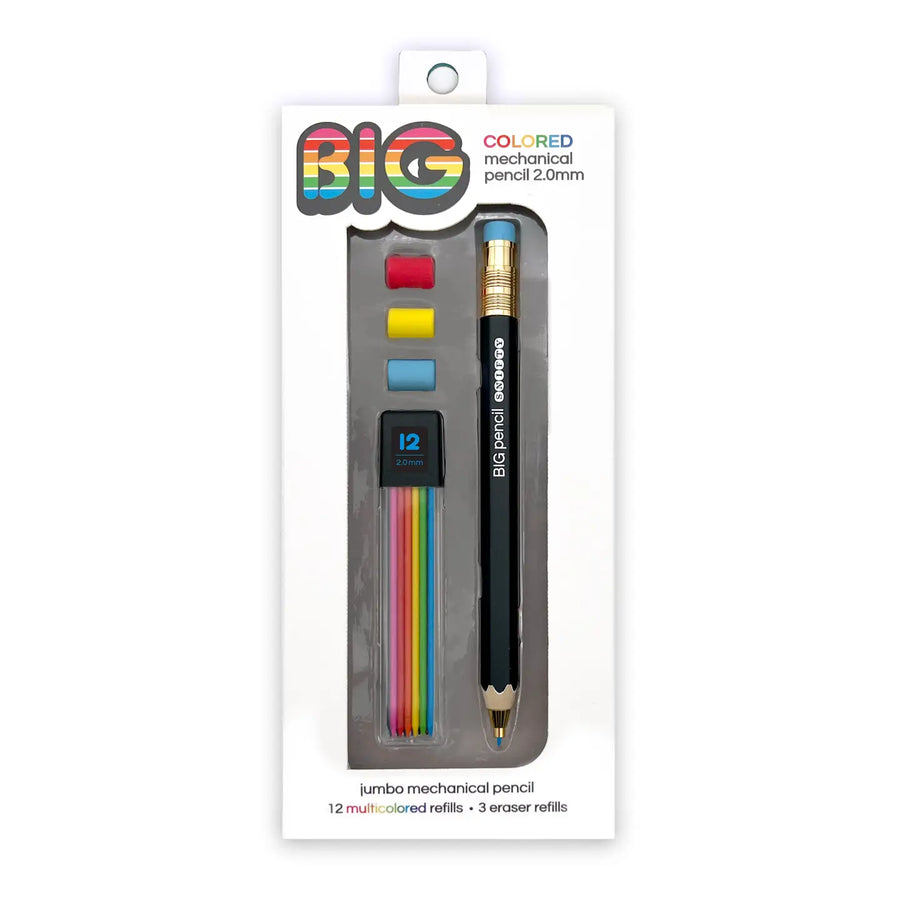 Our BIG COLORED mechanical pencil features a chunky wood barrel and brass tip. Beautifully packaged with a set of 12 multicolored replacement leads and 3 erasers. Takes 2.0mm leads