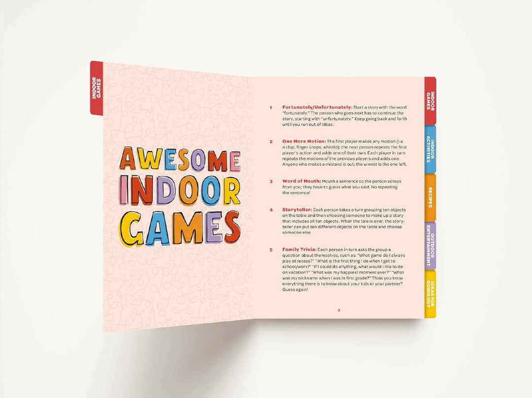 Plan your next family adventure and never get stuck with bored kids again with Everyday Family Activities. With over 100 unplugged activities, there's something here for everyone. You'll never be wanting for things to do as a family, no matter the situation. With tabs on the side for quick and easy navigation when you just don't know what to do next, you'll be able to find activities for all occasions, including: