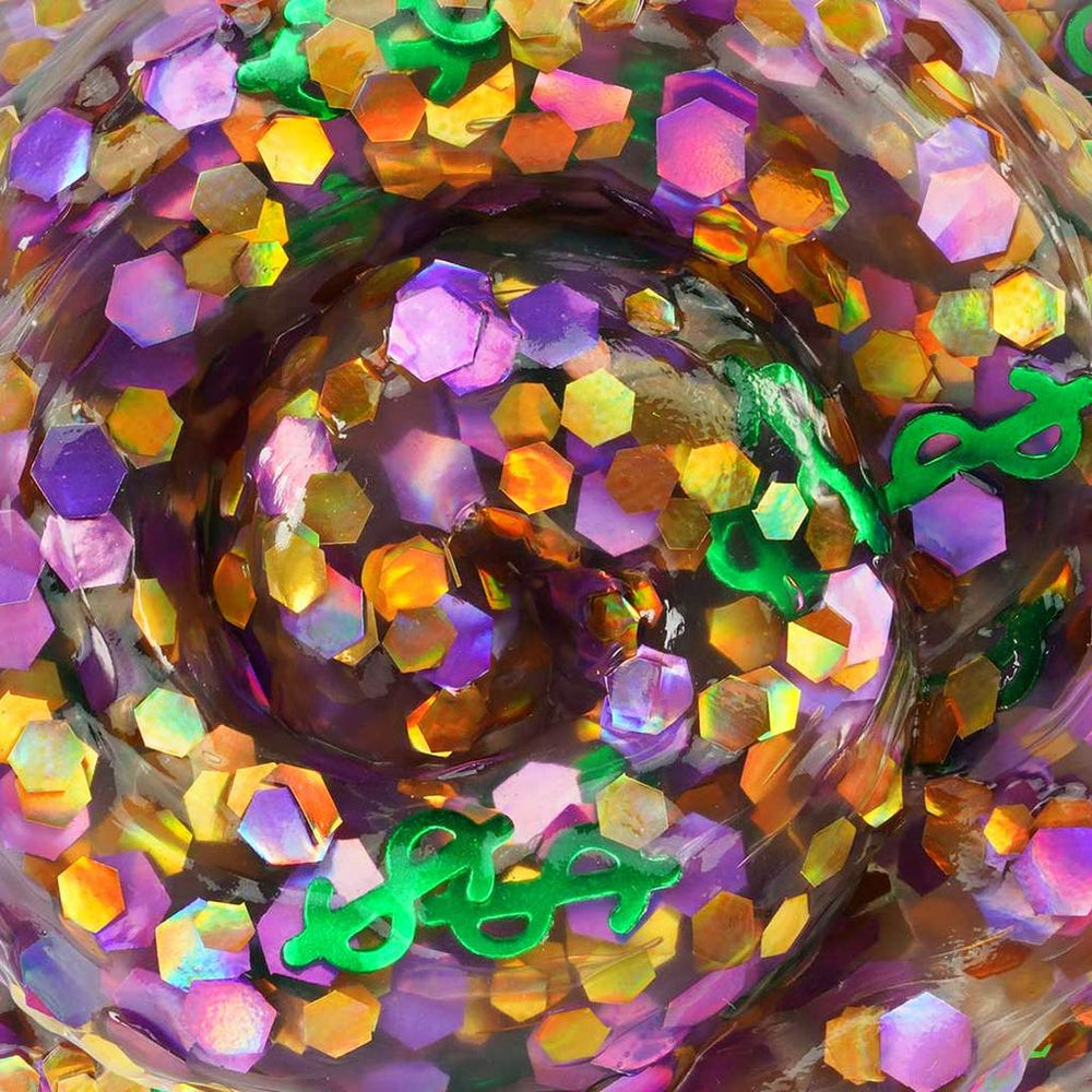 • Color: Gold and purple glitter with green dollar signs | Texture: Soft