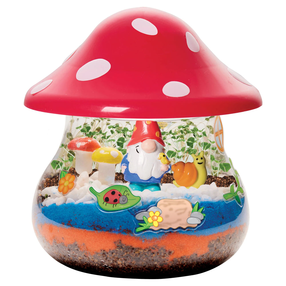 Contents Include: Mushroom Terrarium, gnome figurine, snail figurine, 2 mushroom figurines, sticker sheet, white gravel, blue sand, orange sand, chia seeds, potting mix
