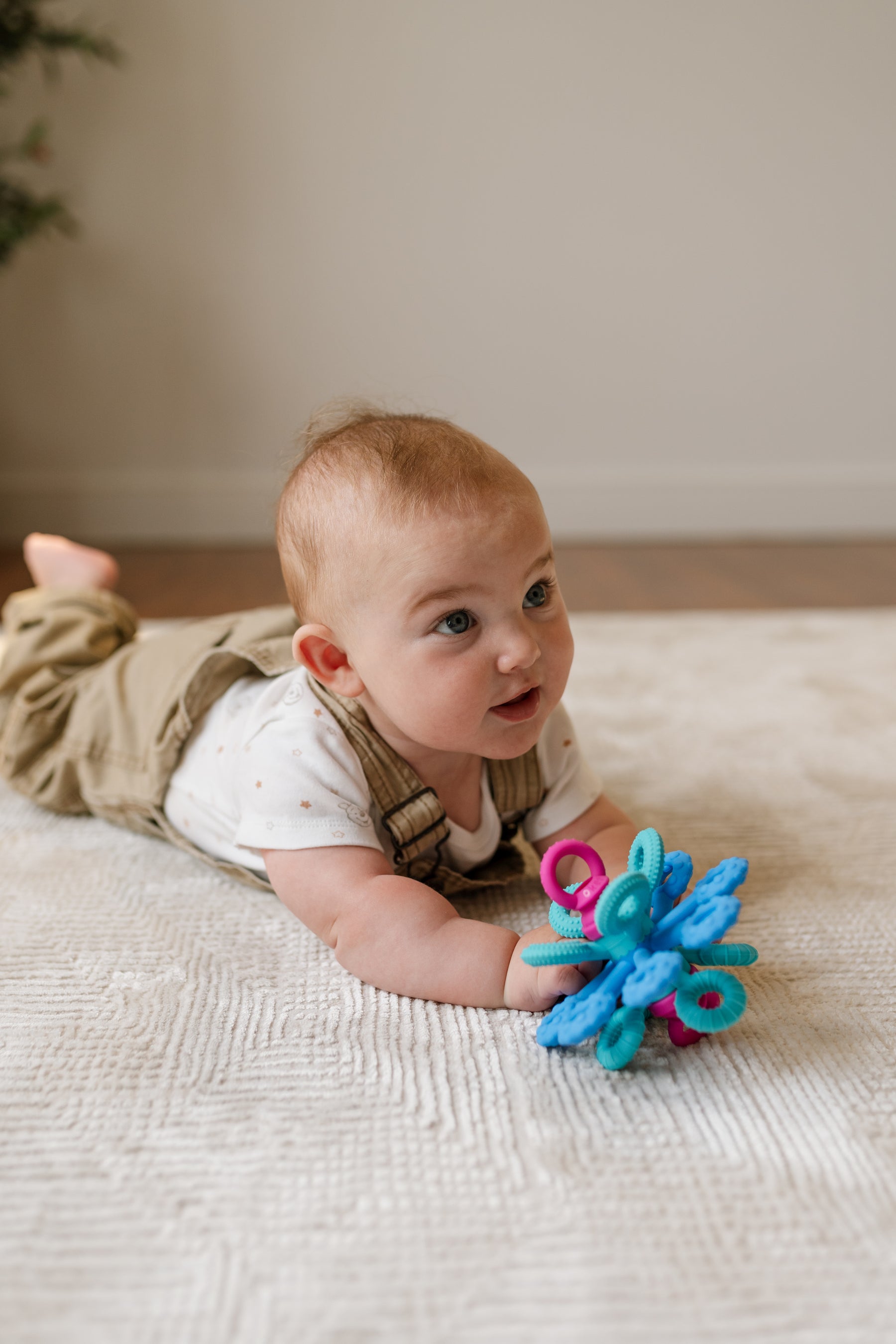 Twist, squish, pull, pop & chew! Okee activity ball is a dynamic playtime companion that is packed with exciting textures and endless play. By providing both stimulating and soothing actions, Okee offers a unique blend of fun and educational value, promoting concentration, coordination and sensory exploration.