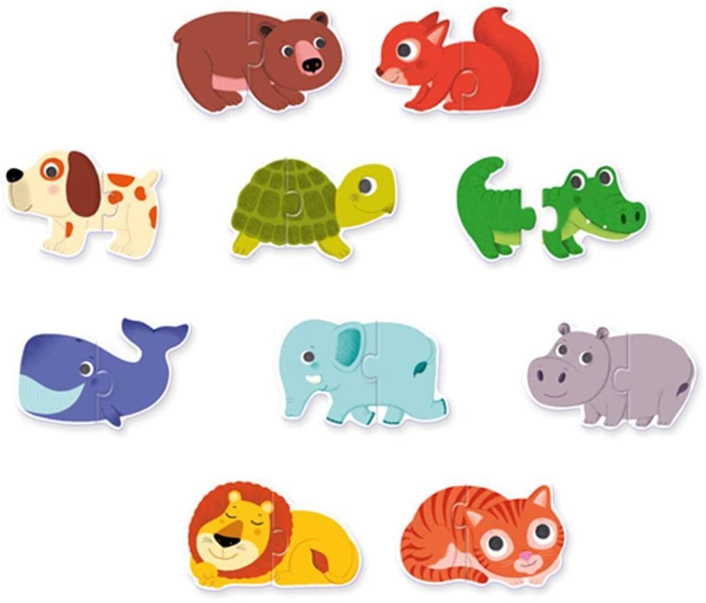 A toddler's first puzzle, help the animals find their match. 10 2-piece puzzles, with pieces big enough for little hands. Beautifully illustrated and visually appealing, made from sturdy cardboard that resists scuffing, bending, and tearing; a great travel item.
