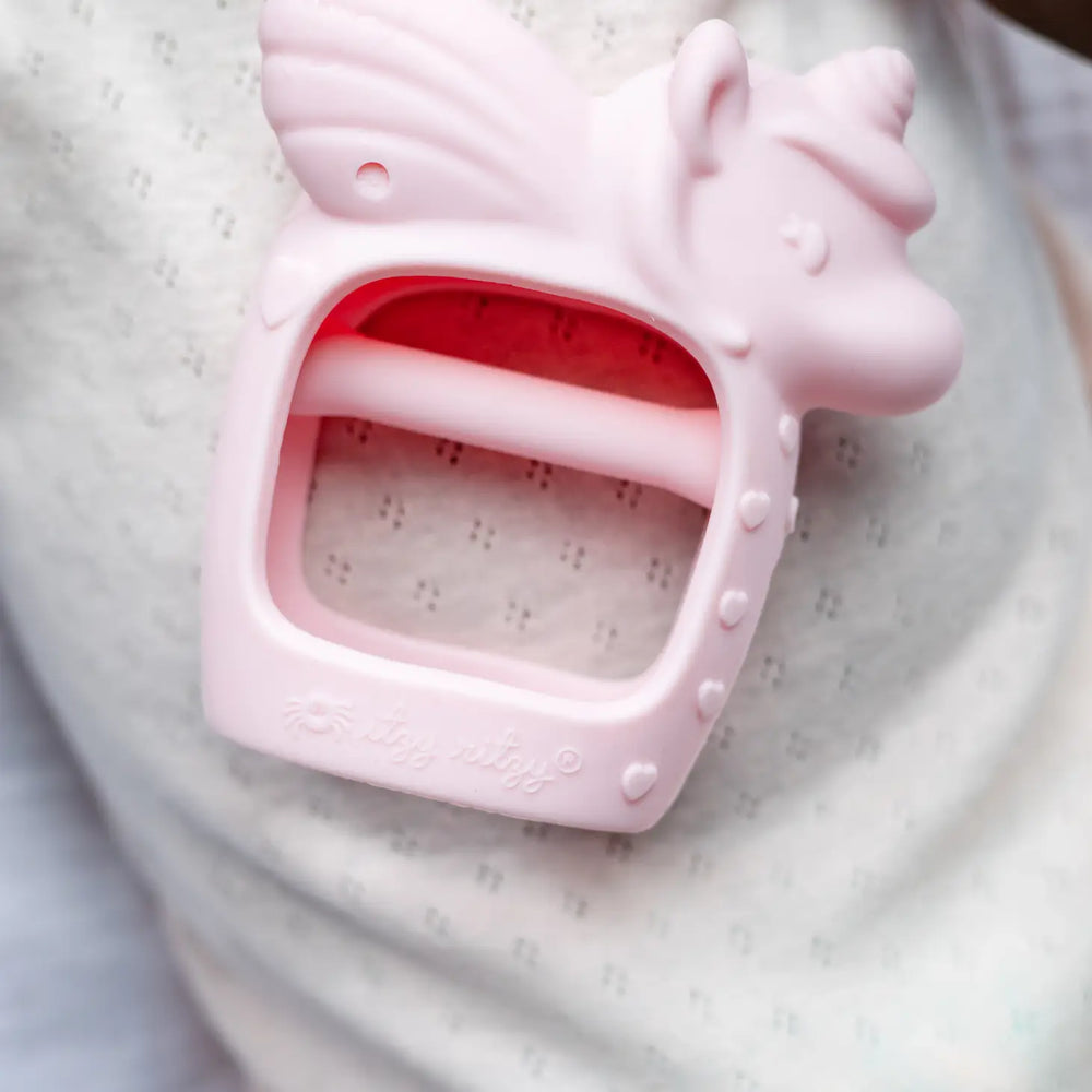 Chew On This! Relief is at hand! This Bitzy Grip™ developmental teether is designed for baby's natural grasp reflex. Multiple textures and soft flexible silicone provide relief to sore gums at all stages of teething.
